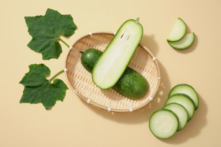 Against a bamboo basket, fresh winter melon cut in half, some slices and leaf of winter melon decorated on a beige background. Winter melon is one of the popular foods in daily meals in Vietnam