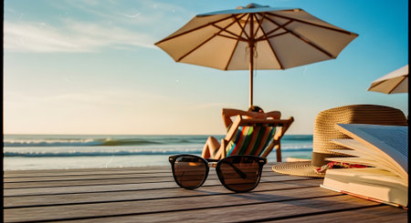A woman lounges comfortably on a deck chair, wearing fashionable sunglasses and a sun hat. She enjoys the bright and warm atmosphere.
