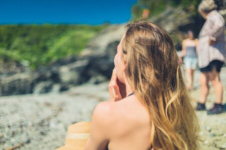 Summer vacation. Sexy girl in bikini sunbathing tanning on the beach. Young woman relaxing with mobile phone on the sea coast. Summertime.