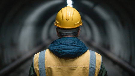 A lone worker in a bright yellow helmet and reflective vest stands at the entrance of a dark tunnel, contemplating the industrial space ahead.