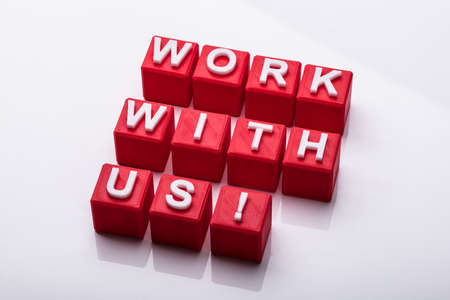 High Angle View Of Red Cubes Showing Work With Us Text Over White Background