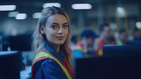 Portrait Of Female Worker In Busy Modern Warehouse Working On Computer Terminal. Generative AI