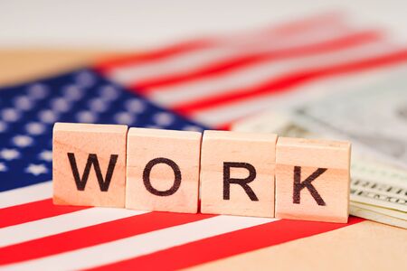 WORK alphabet on USA America flag with dollar banknotes.