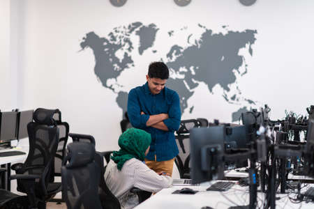 Multiethnic startup business team Arabian woman wearing a hijab on meeting in modern open plan office interior brainstorming, working on laptop and desktop computer. Selective focus
