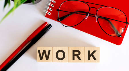 WORK Text of business office on wooden cubes in front of office desk with office tools
