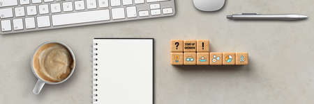 cubes with word START-UP and tech icons with office equipment on paper background