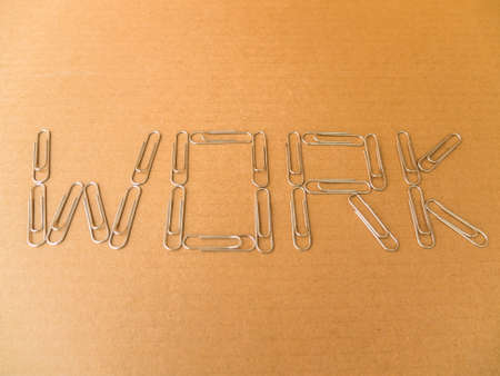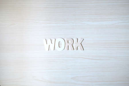 The word WORK, Wooden letters on wooden table. Top view.