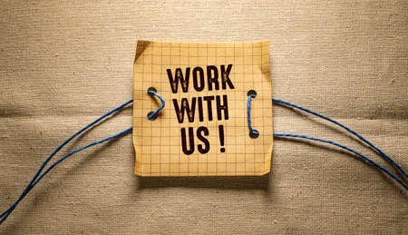 work with us - text on a piece of paper on a linen background