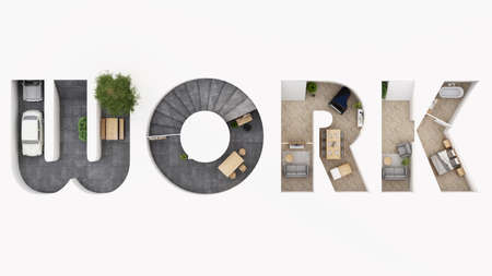 Isometric home office in WORK alphabet shape, concept of work from home, goal of life, Work Life Balance with furniture used in daily life. in white and wood tones, 3D rendering and illustration.