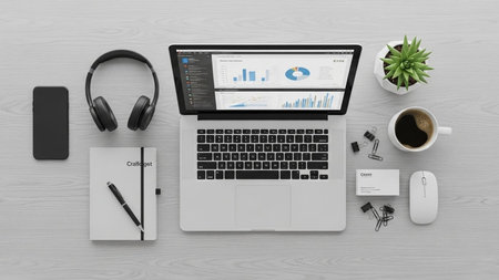 This flat lay image captures a modern office workspace with a laptop, financial documents, smartphone, and essential stationery, perfect for business planning.