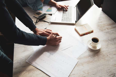 Cropped shot of start up business team working together with digital devices, office supplies and business chart in meeting room
