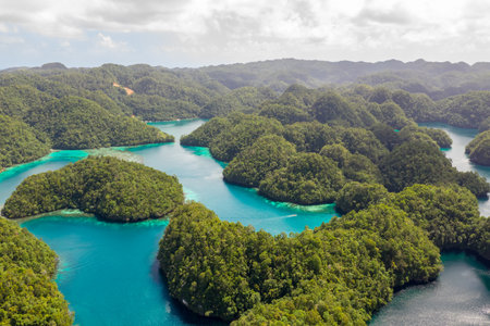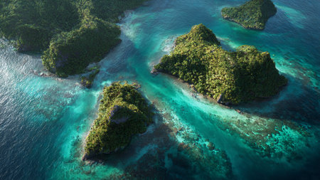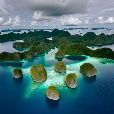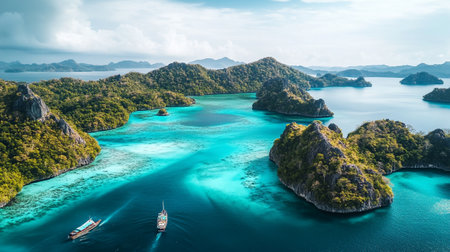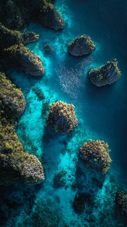 beauty of natural archipelagos from above, highlighting the patterns created by interconnected islands, reefs, and lagoons.