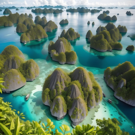 Raja Ampat's aerial panorama showcases turquoise lagoons, clusters of tiny islands, and coral reefs teeming with marine