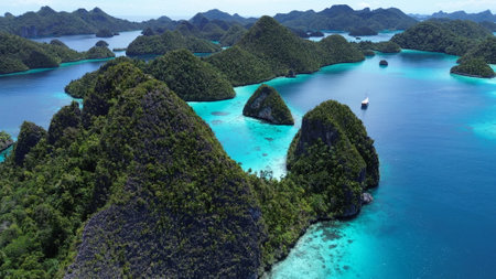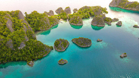 Aerial view of tropical islands, reefs, and lagoon in Raja Ampat, Indonesia