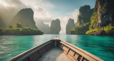 AI Generated. Serene boat ride through crystal clear waters surrounded by lush greenery and rocky cliffs on a tranquil island adventure
