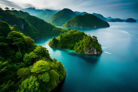 Immerse yourself in the breathtaking beauty of a serene body of water surrounded by a lush forest canopy, A bird's eye view of islands surrounded by crystal clear water, AI Generated
