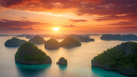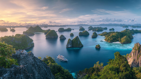 High-angle view of a luxury yacht sailing through dramatic tropical karst islands at sunset. Vibrant orange clouds reflect on the calm, turquoise ocean waters.