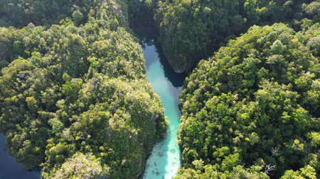 Aerial view of Sugba lagoon. Beautiful landscape with blue sea lagoon, National Park, Siargao Island, Philippines.