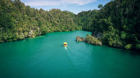 Let adventure lead the way. High angle shot of a boat sailing through a canal running along the Raja Ampat Islands in Indonesia.