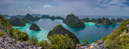View from the top of the cliff at remote archipelago Pulau Wayag, Raja Ampat, Indonesia