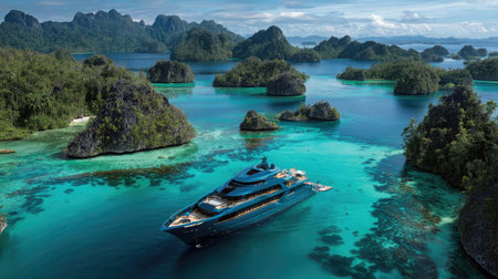 A breathtaking view of a luxury yacht anchored in stunning turquoise waters surrounded by lush green islands and intricate rock formations, offering a serene escape.