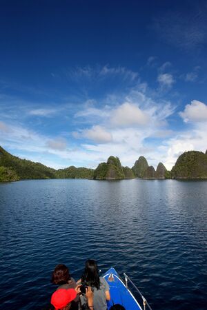 Tourists are on the top of the cliff of remote archipelago Pulau Wayag, Raja Ampat, Indonesia