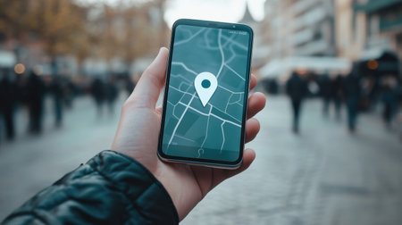 A male hand grasps a mobile phone featuring a prominent location pin on its screen in a bustling urban environment at dusk.