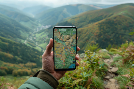 Close-up view of a hiker using smartphones GPS app in mountain travel. In the palm of their hand, the hiker holds the key to their mountain journey: GPS.