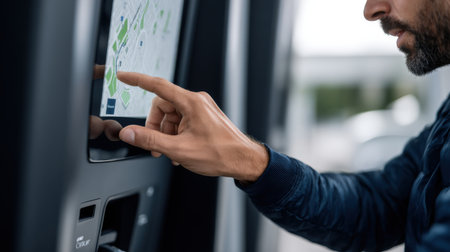 A digital kiosk displaying bus routes and schedules with a man using it to plan his trip