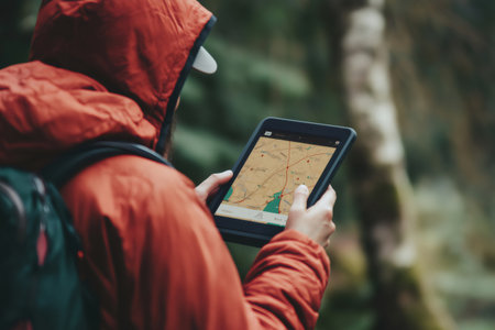 Hiker in an orange jacket engaging with a navigation app on a tablet while traversing a scenic forest trail in the wilderness