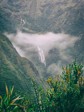 Vertical photo of flowers with waterfall and mountains with fog on the background along the Inca Trail. Peru. No people.