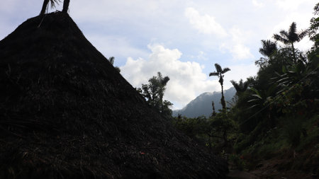 Mountains landscape, rainforest, jungle, blue sky, clouds and mist. Volcano on the island of Camiguin. Travel concept.