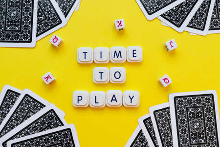 Time to play message made with board game letters, over a bright yellow background, surrounded by dice and playing cards on the corners of the image