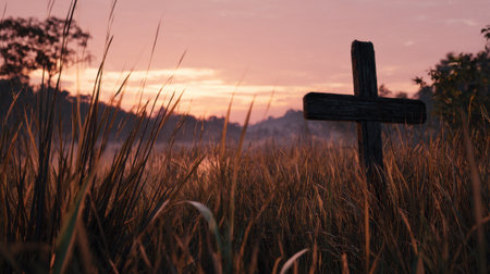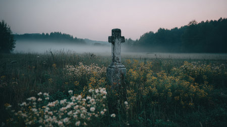 Weathered cross stands in misty field surrounded by wildflowers, evoking sense of tranquility and reflection. soft light of dawn enhances serene atmosphere of this peaceful landscape
