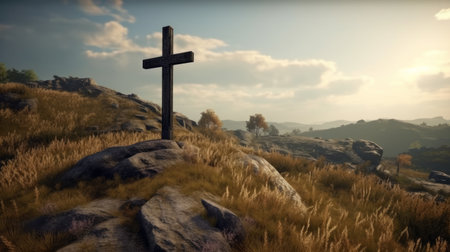 Christian catholic cross on the hills. Generative AI illustrator