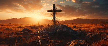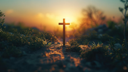 A serene cross in grass illuminated by a warm sunset, symbolizing hope and renewal for Easter.,