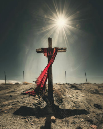 Desolate cross memorial desert landscape spiritual symbol dry environment ground level reflection on faith