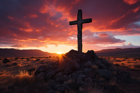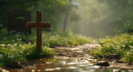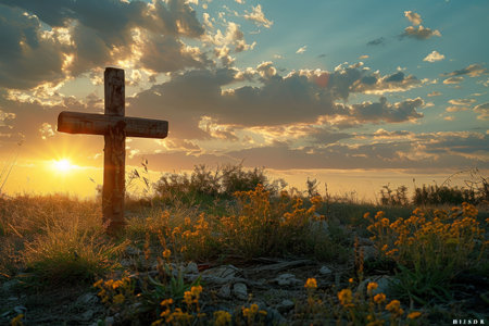 Concept photo of a solitary wooden cross, planted in a field of wildflowers, as the first rays of the sun peek over the horizon, evoking feelings of hope and rebirth