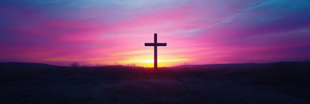 Cross against a colorful sunrise, providing space for inspiring or reflective messages