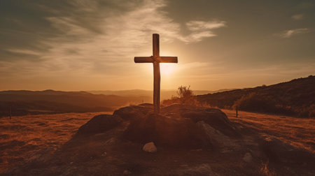 AI Generated. Glowing Wooden Cross Sunset Landscape Spiritual Image