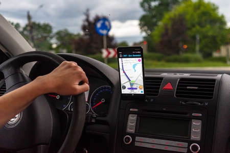Driving and using waze maps application on smartphone on car dashboard, Driver using Waze maps app in Bucharest, Romania, 2021