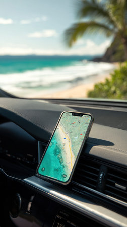 A smartphone is positioned on the dashboard, showcasing a map while parked at a scenic turnout, with beautiful ocean waves and palm trees creating a vibrant travel atmosphere