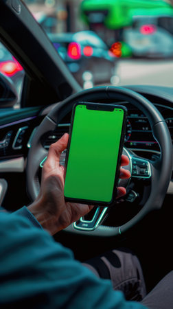 Mobile phone with a green screen in a man's hand inside a car. Blank screen for content integration, mock up
