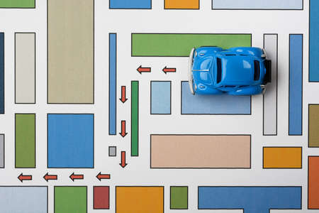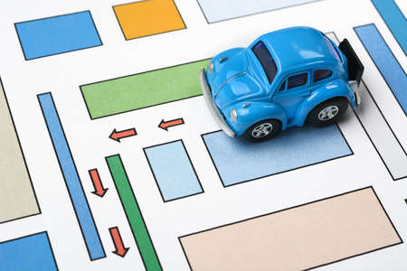 Two vintage toy cars placed on a detailed folded road map, symbolizing travel planning and road trips. Space for text available