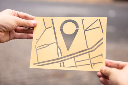 A female's hand holds a cellphone with an open online maps app. The concept of online navigators and applications for smartphones. Close up. Blurred background.