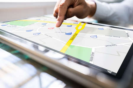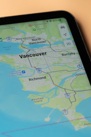 New York, USA - August 24, 2023: Car traffic in Vancouver on google maps app on tablet screen close up view