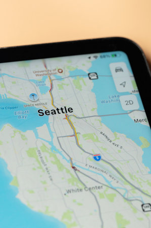 New York, USA - August 24, 2023: Car traffic in Seattle on google maps app on tablet screen close up view