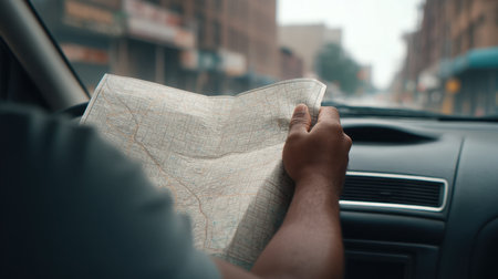 A person holds a paper map while seated in a vehicle, surrounded by urban scenery. The image captures the essence of exploration and navigation in a busy city.