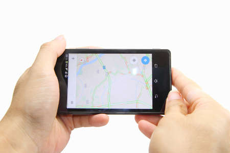 Ufa, Russia January 30, 2019: Female hand holding smart phone with Google map gps navigation application with planned route on the screen.