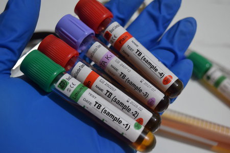 TB sample 1,2,3,4 - Test with blood sample. Top view isolated on office desk. Healthcare or Medical concept